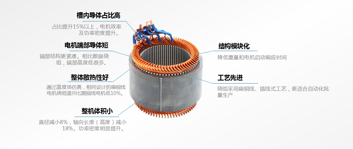 我司驱动系统采用国际前沿的扁线发卡技术,电机采用方截面硬铜线制成绕组,相比传统的圆线电机,扁线绕组更易于自动化量产,具有产品一致性更好,槽满率更高,功率密度更大等优点。采用扁线技术的电机能降低8%-12%的有效材料成本。