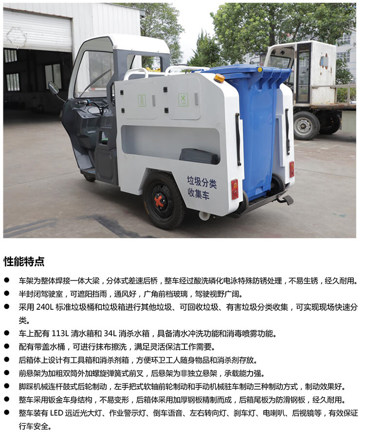 麻豆乱淫一区二区三区垃圾分类三轮双桶保洁车,采用240L标准垃圾桶和垃圾箱进行其他垃圾、可回收垃圾、有害垃圾分类收集,可实现现场快速分类。配有小型水箱,具备清水冲洗功能和消毒喷雾功能,满足灵活保洁工作需要。整车操作简便、耐用、省时、省力,小巧灵活,且易清洗,极大地减少人力,提高保洁效率。