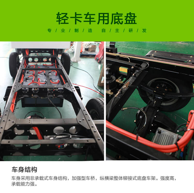l 底盘采用车架纵横梁整体铆接式轻卡车用底盘设计,选用卡车专用钢板,底盘整体强度高,承载能力强。