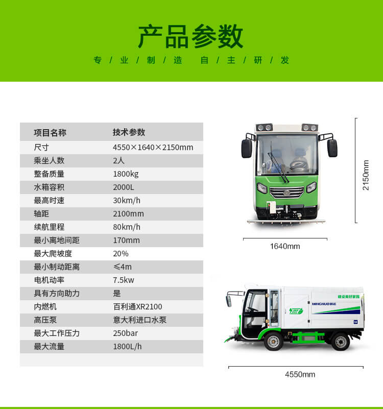 该车配备前置冲洗装置和可移动喷水枪,可用于路面养护、地面清洁、植被清洁浇灌、建筑物雕像清洁等,也可用于消毒和喷洒农药。适用于路面养护、冲洗路边摊地面油污和清除城市中“牛皮癣”、 小广告、道板、护栏、路崖的死角等部位。